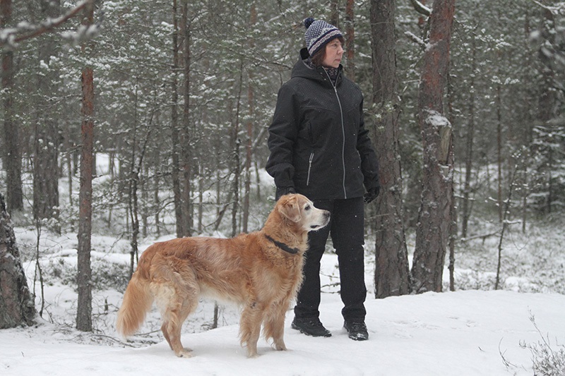 Työn vastapainoksi Terhi Aho lähtee kävelylle koiran kanssa. ”Ennen, kun koira oli nuorempi, käytiin koiraharrastuksissa, mutta nyt, kun koiralle on tullut ikää, käyn kävelyllä sen kanssa. Myös pihaa tykkään laittaa,” kertoo Aho. Kuva: Kari Aho