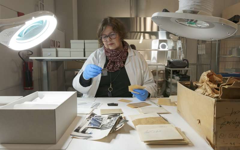 Pääkuvan tiedot: Tutkija Mari Aaltosen työpöydällä on vedoksia ja negatiiveja, jotka hän järjestää aiheen ja kuvatyypin mukaan. Ilari Järvinen / Museoviraston Kuvakokoelmat