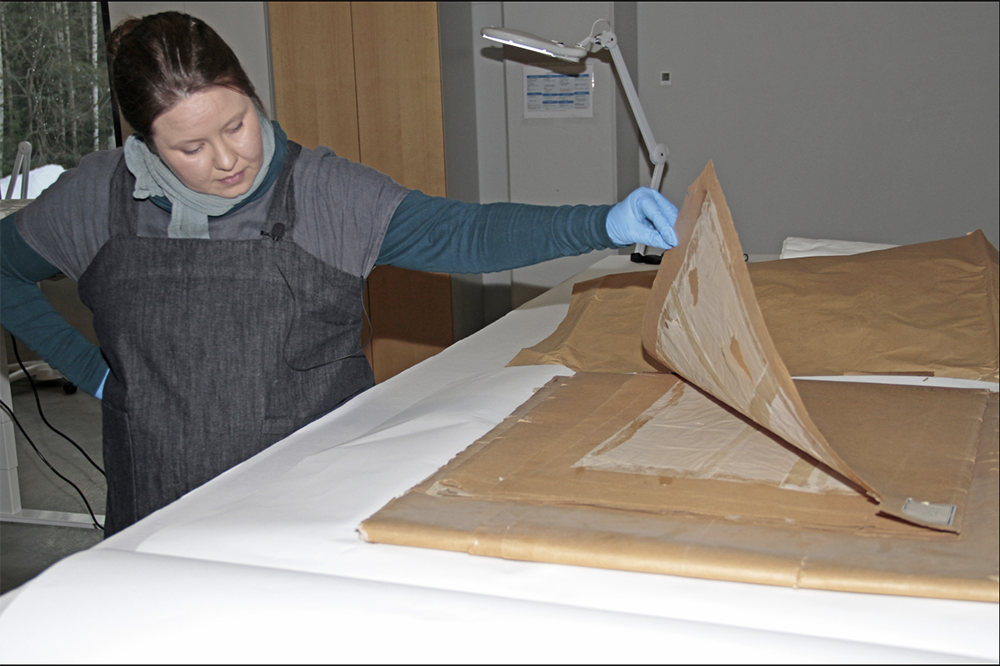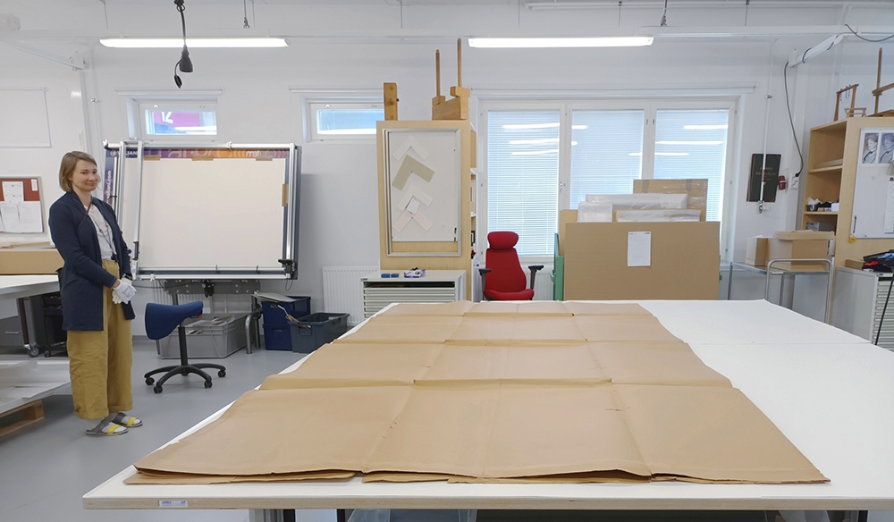 Konservaattori Erika Tiainen ihmettelee Gustaf Aspin ja Kaarlo Vuoren tekemää kalkeerausta Lohjan kirkon kalkkimaalauksesta. Kalkeeraukset on yhdistetty noin 3 x 6 metrin kokoiseksi valtavaksi piirustukseksi, joka on kuvassa taiteltu neljään osaan. Kuva Sara Théodore /Museoviraston Kuvakokoelmat, 2022.