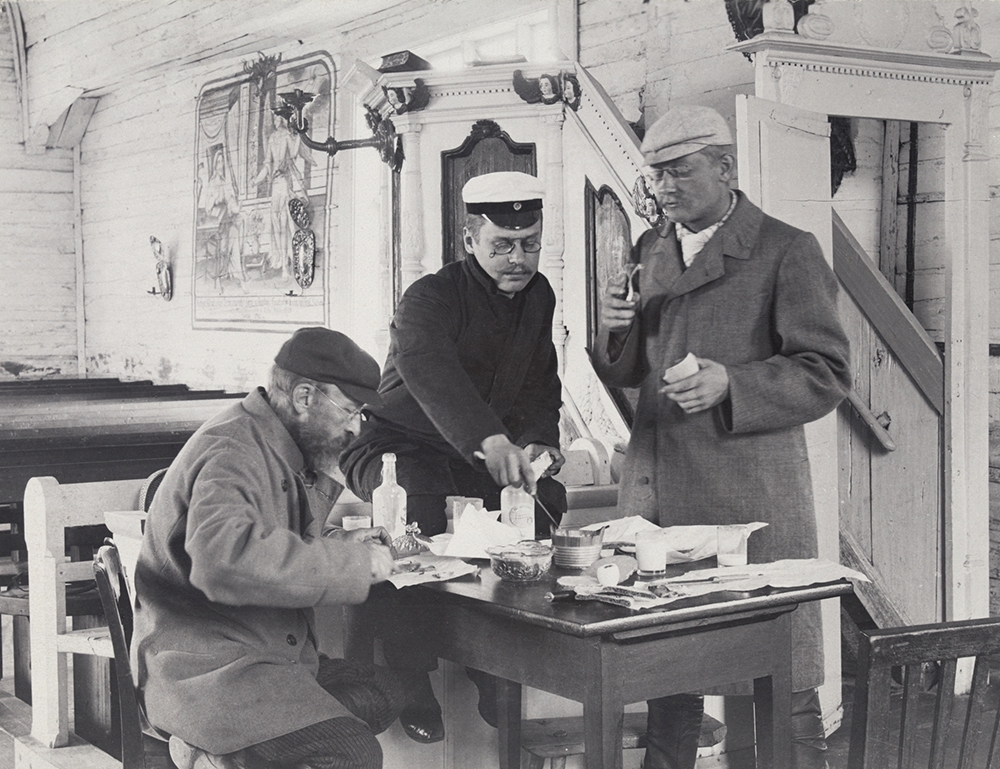 Axel Wikström, Emil Nervander, Armas Lindgren ja mahdollisesti postimies jonottavat postiveneeseen Siikajoella vuonna 1896. Suomen Muinaismuistoyhdistyksen VI taidehistoriallinen retkikunta.