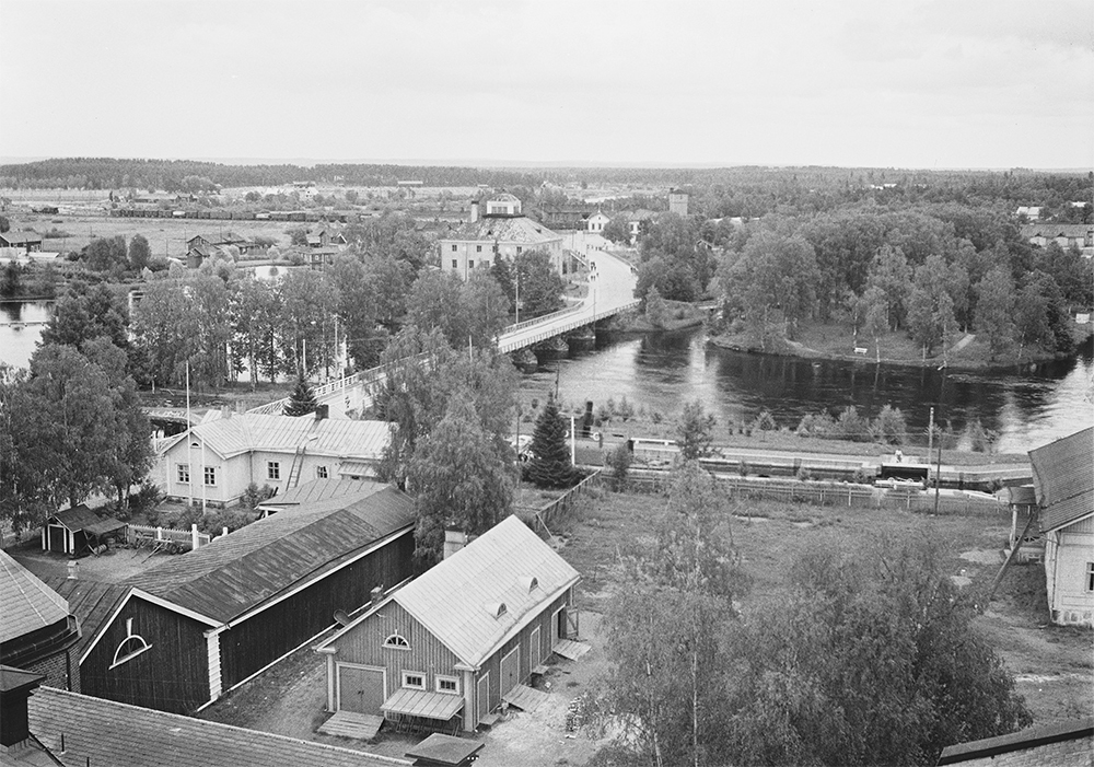 Joensuun länsisilta, jonka päässä vasemmalla on suojeluskuntapiirin talo "Pielisjoen linna". Kuva on otettu vuonna 1936. Kuva: Pietinen, Historian kuvakokoelma, Museovirasto