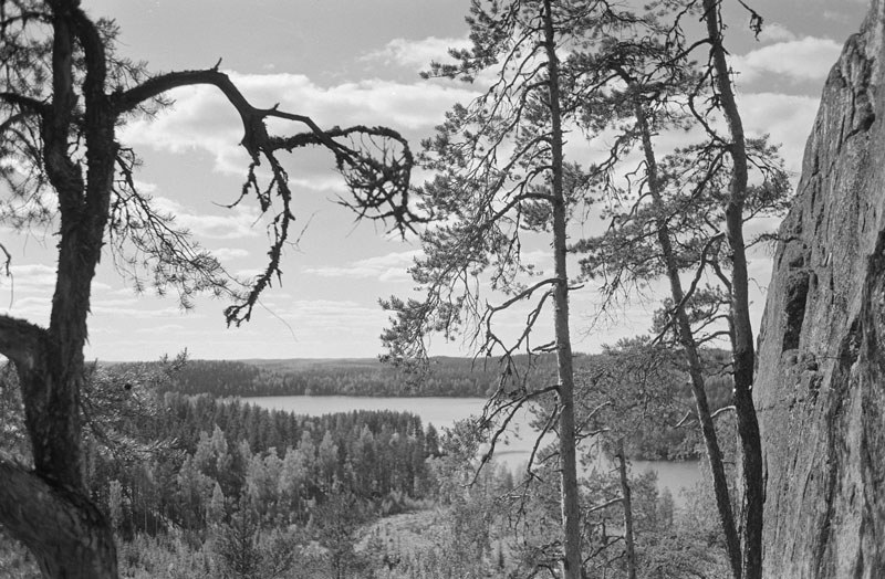 Kuva: Metsä ei ole suomalaisille pelkkä resurssi. Korkealta kuvattu näkymä metsien ympäröimille järville on keskeinen osa suomalaista kansallis- ja sielunmaisemaa. Kuva Valkealasta 1920-luvulta. Kuva: Matti Poutvaara, Kansatieteen kuvakokoelma, Museovirasto.